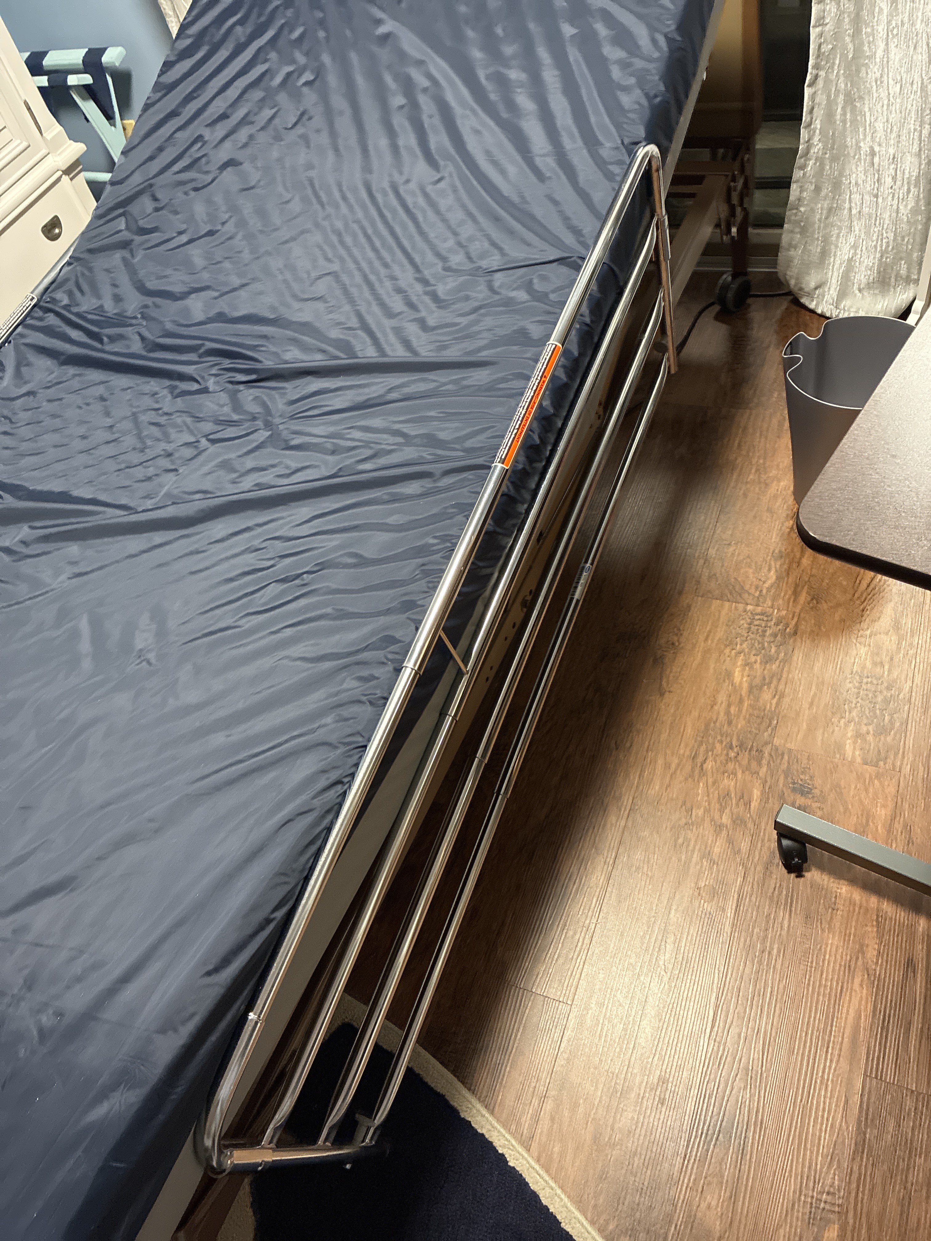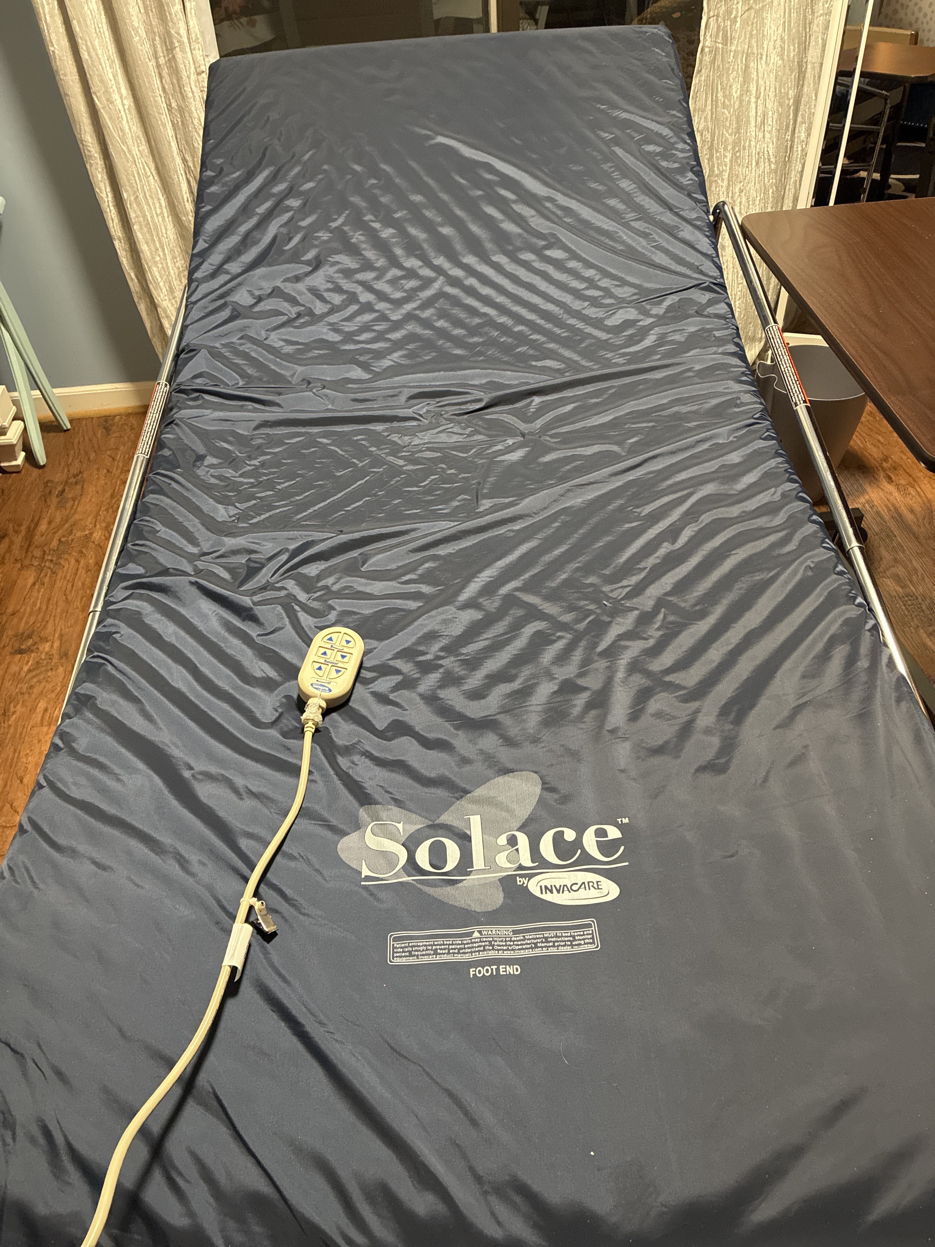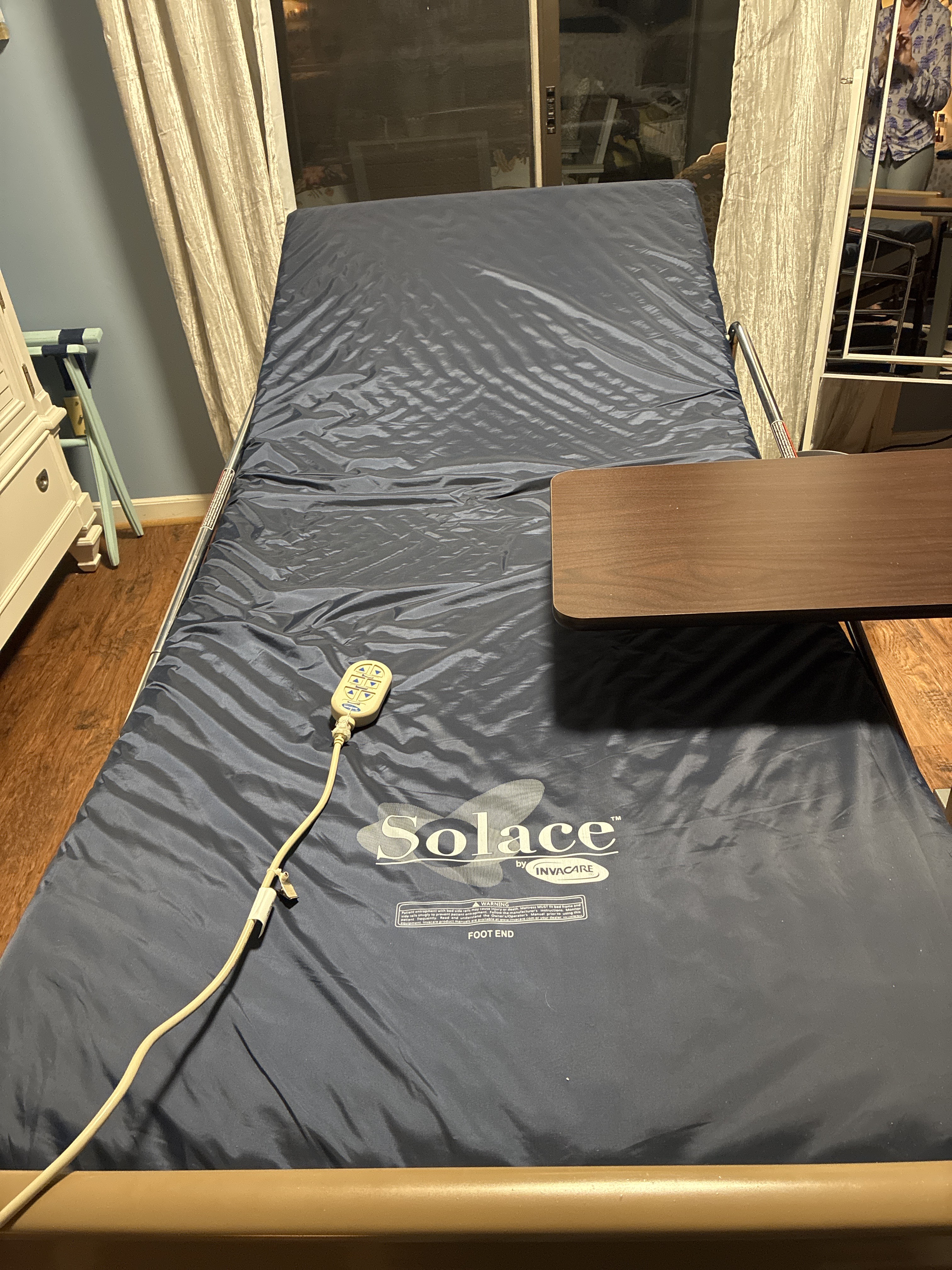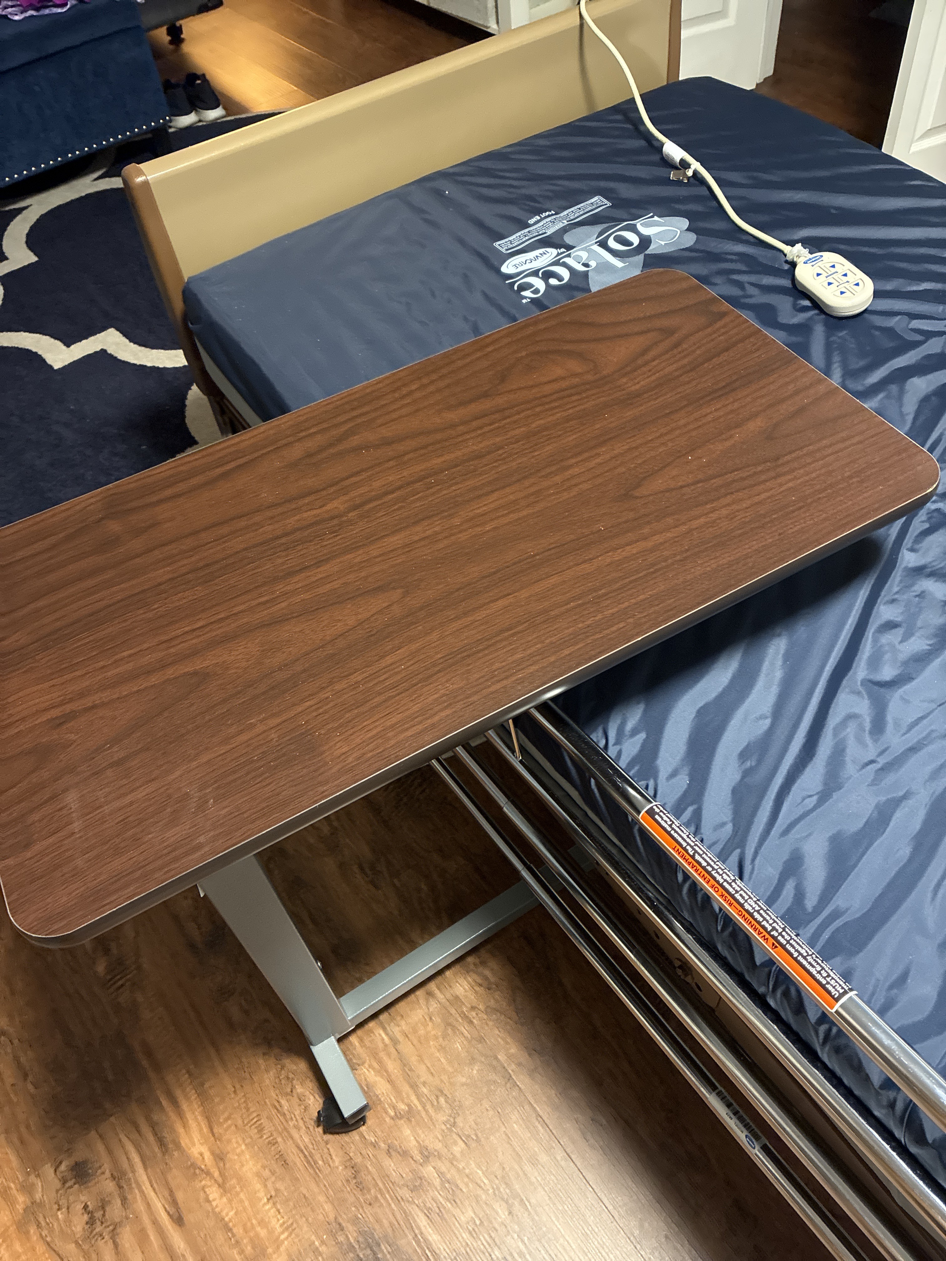 Fully electric Invacare hospital bed Fully electric Hospital bed, mattress, side rails, 2 fitted sheets and rolling hospital table. |